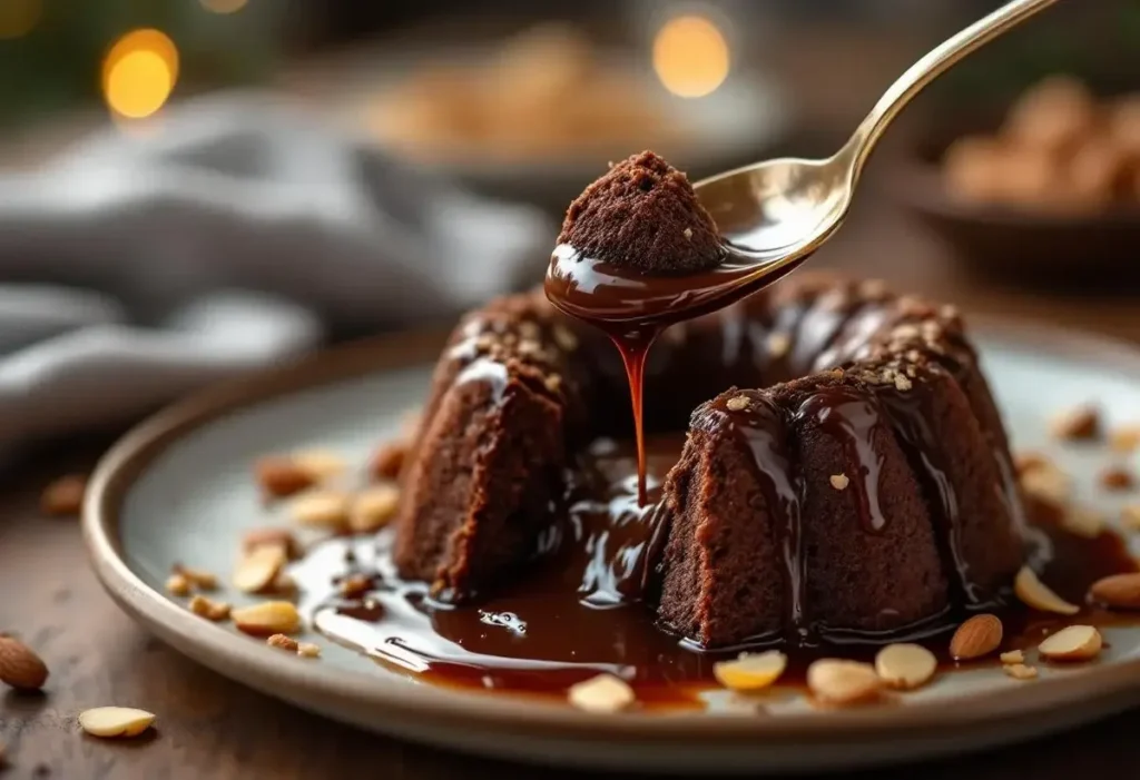 À la sortie du four, on ne traîne pas. Versez une généreuse cuillère de praliné sur chaque moelleux encore chaud. Ajoutez les éclats d’amandes toastées et terminez avec une pincée de fleur de sel. Le chaud, le fondant, le croustillant… tout est là.