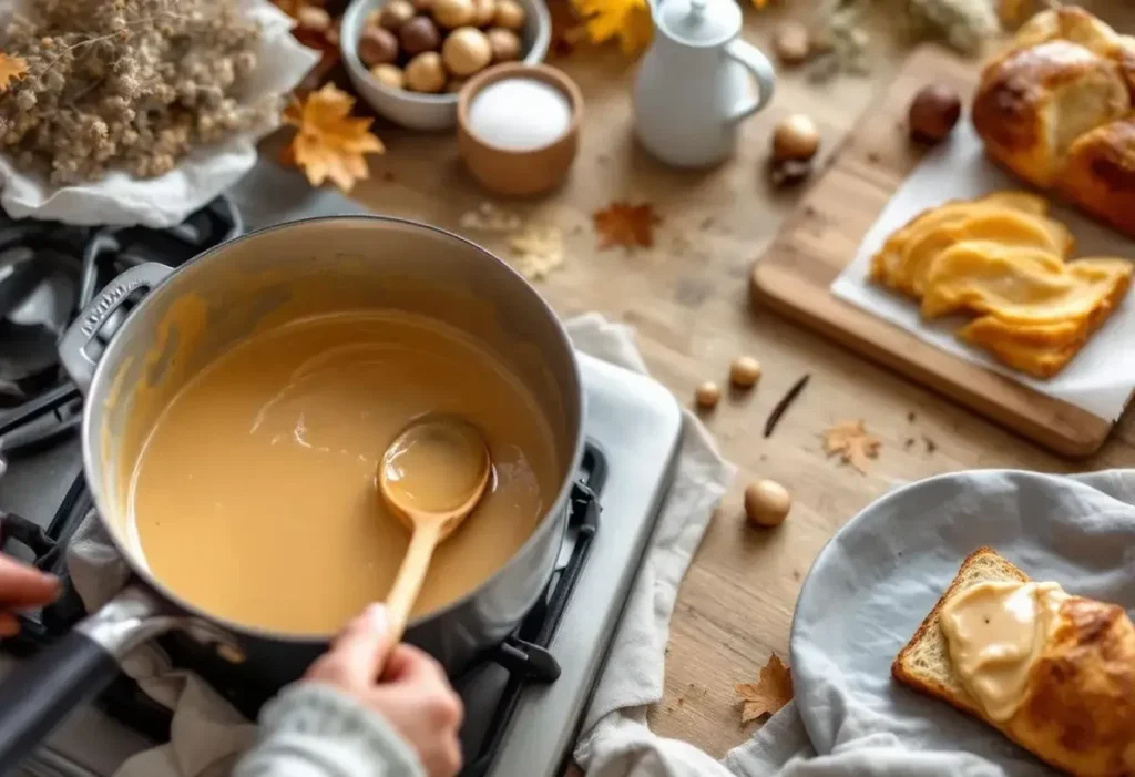Remuez constamment — et oui, c’est important — pendant 20 à 25 minutes. Le mélange va épaissir, devenir brillant et embaumer votre cuisine d’un parfum irrésistible.